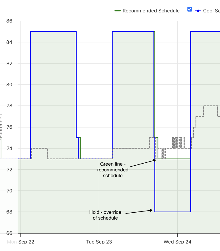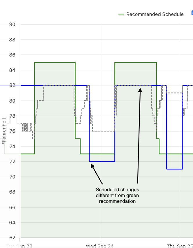 You can see that the thermostat is on a different schedule when the setpoint line (blue) and the green line (our recommended thermostat schedule) rarely overlap.